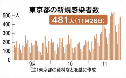 都内の1日当たりの新規感染者は21日の539人が過去最多。11月上旬から感染状況が悪化しており、都の「モニタリング会議」は4段階の警戒レベルで最も深刻な「感染が拡大している」と評価している。