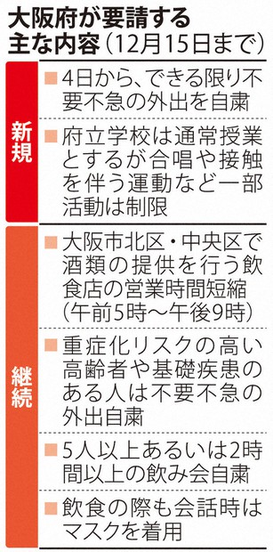 「病床が空いてもすぐに埋まり、医療体制やスタッフの負担も限界に近づいている」。重症者も受け入れている大阪市立総合医療センターの白野倫徳医長は訴える。11月初めから重症者が増え始めた。「赤信号をともしても、患者が減るには3週間くらいはかかる。もっと早く対策を打ってほしかった」