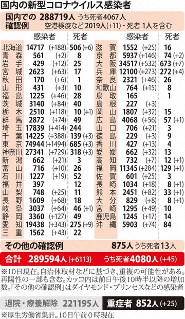新型コロナウイルスの感染者は10日、国内で新たに6113人が確認され、1日当たりの感染者数は日曜日としては最多を更新した。クルーズ船の乗客乗員らを合わせた累計の感染者数は28万9594人、死者は45人増えて4080人。重症者数(10日午前0時現在)は前日比25人増の852人で、過去最多となった。